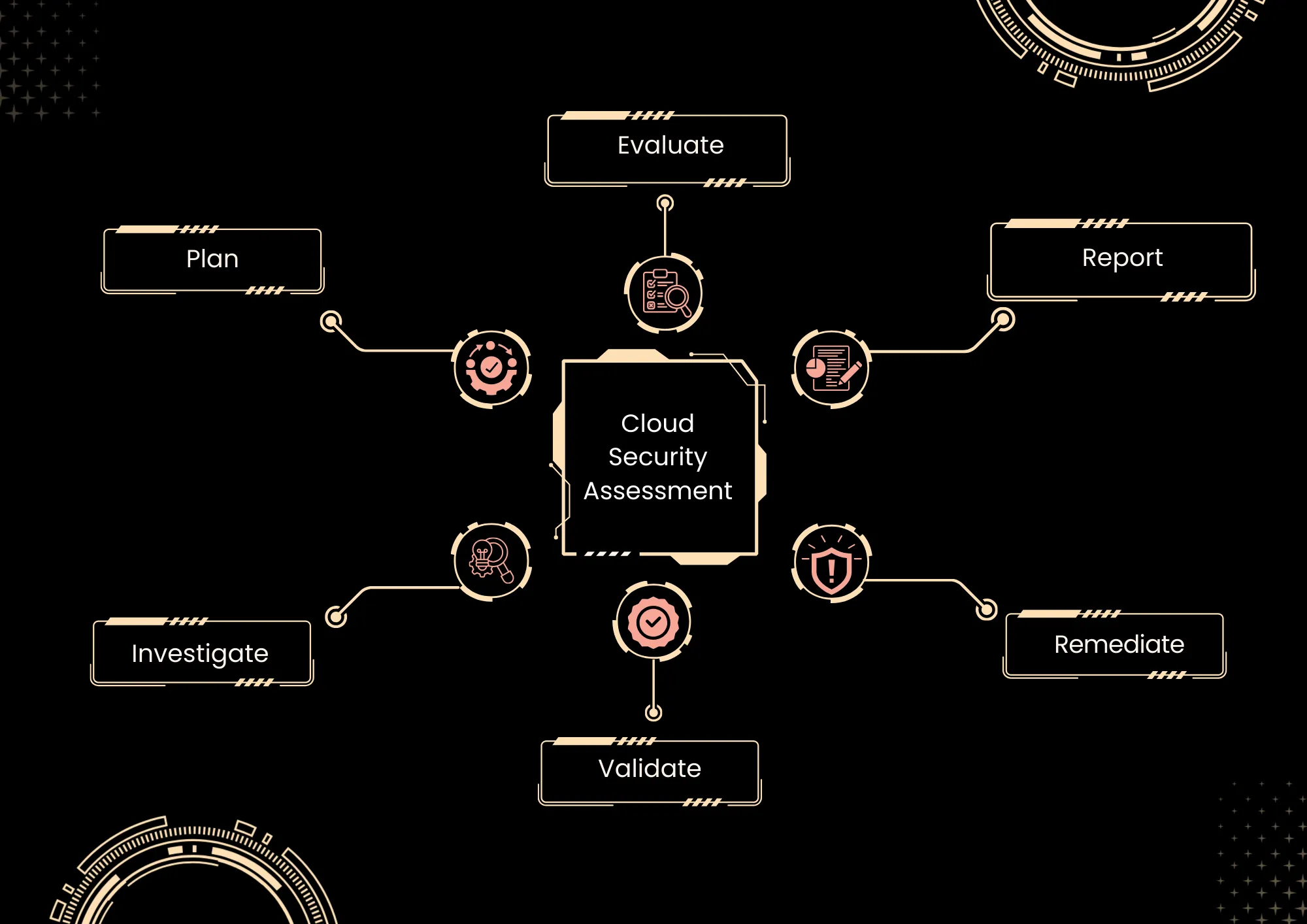 The process involves scoping the environment, gathering data on configurations and policies, analysing risks, and testing via scans or penetration simulations. Key components cover identity management, storage security, workload protection, and incident response readiness.