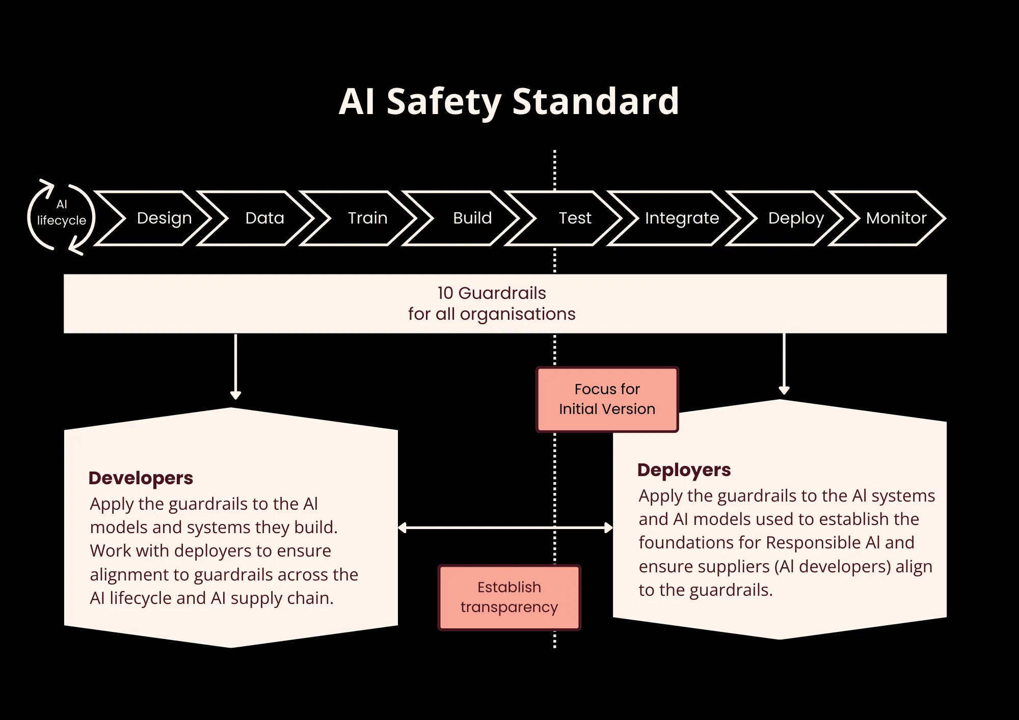 The Voluntary AI Safety Standard aims to help organizations build a foundation for responsible AI by focusing on risk management, safety testing, transparency, accountability, and security. The guardrails are aligned with other responsible AI standards, such as the NIST AI RMF, ISO 42001, and the EU AI Act, which means adopting the Standard soon will help organizations meet future regulatory obligations.