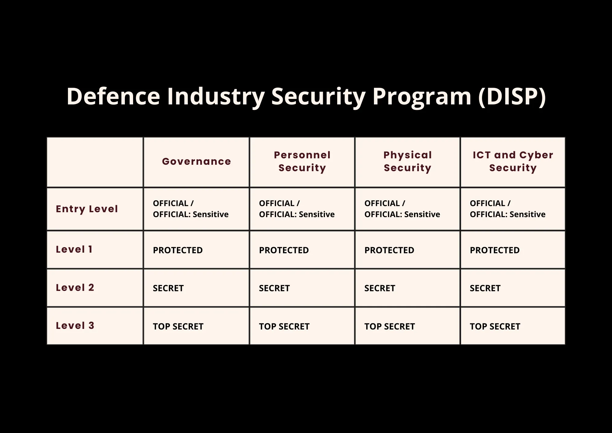 The DISP features four membership levels within each category, corresponding to information access based on security classifications: OFFICIAL, OFFICIAL: Sensitive, PROTECTED, SECRET, and TOP SECRET.